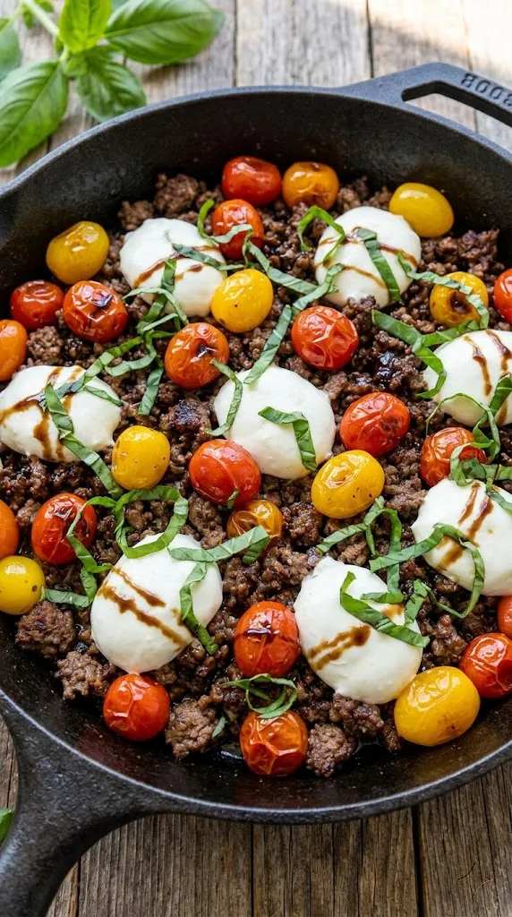 7. Caprese-Style Sweet Tomato & Beef Skillet