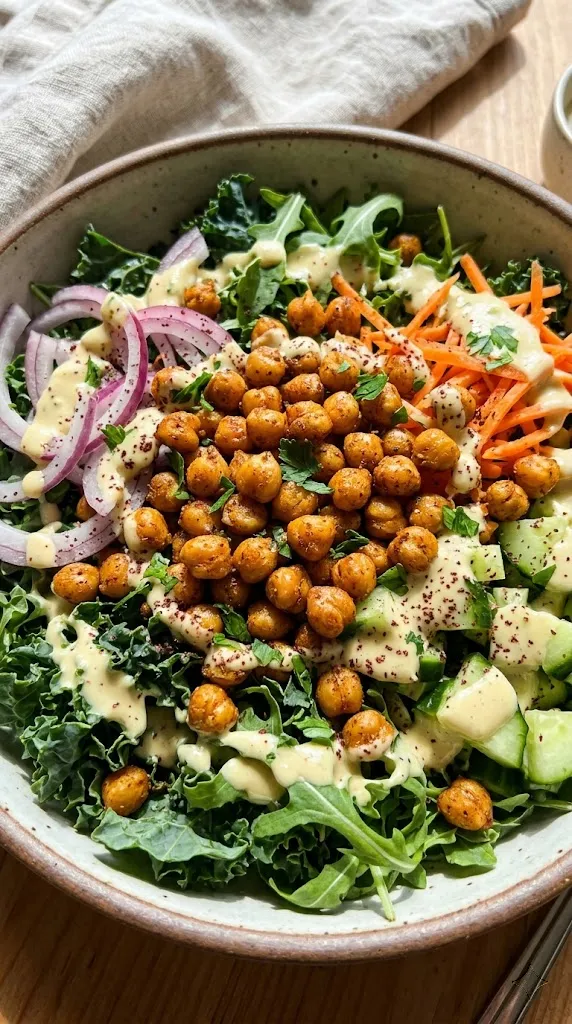 The crispy chickpeas have this amazing smoky flavor that feels totally decadent. But that dressing—it’s nutty, bright, and so creamy without any dairy. It clings to every leaf. Honestly, I could probably drink the dressing by itself. Don’t judge. 🙂