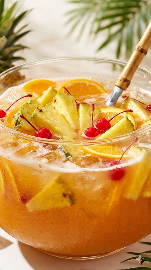 We’re going full tropical here. This punch smells like a vacation and tastes like you should be sitting on a beach, even if you’re just in your suburban driveway. It’s sweet, boozy, and dangerous in the best way.