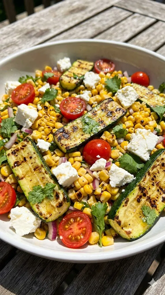 - Combine the charred corn, zucchini, red onion, feta cheese, and cilantro in a large bowl.