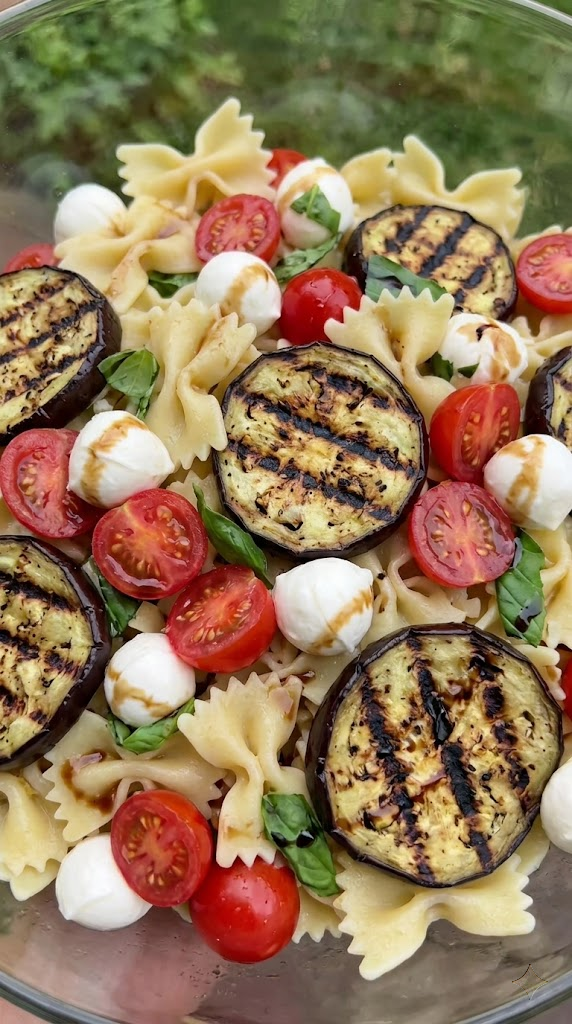 - In a large bowl, combine the pasta, grilled eggplant, tomatoes, mozzarella pearls, and basil.