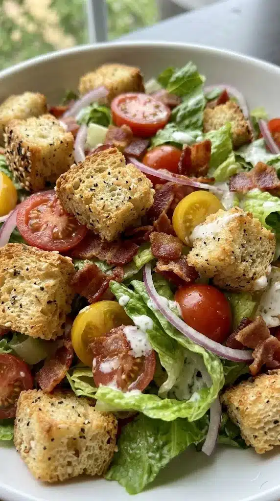 If a salad is 80% bread, count me in. This is a mashup of two classics: the Italian Panzanella (bread salad) and the American BLT. The croutons are homemade (easier than you think), and they soak up the dressing and tomato juices while staying slightly crunchy. Yes, please.