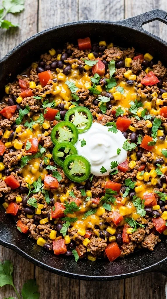 This is my “emergency dinner” when the day has gotten away from me. It delivers all the comforting flavor of tacos but in one glorious skillet, minimizing cleanup. We love that.