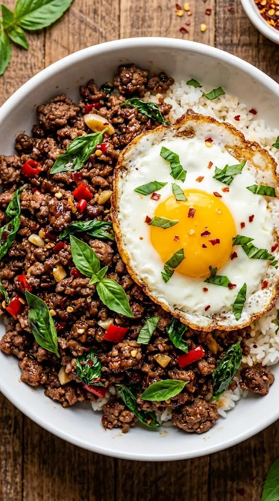 The balance of flavors is incredible—salty, sweet, spicy, and the basil provides a beautiful, aromatic lift. The fried egg on top with its runny yolk is essential, IMO, as it adds a rich, creamy element that brings the whole dish together. It’s a total flavor adventure that takes about 15 minutes to cook.