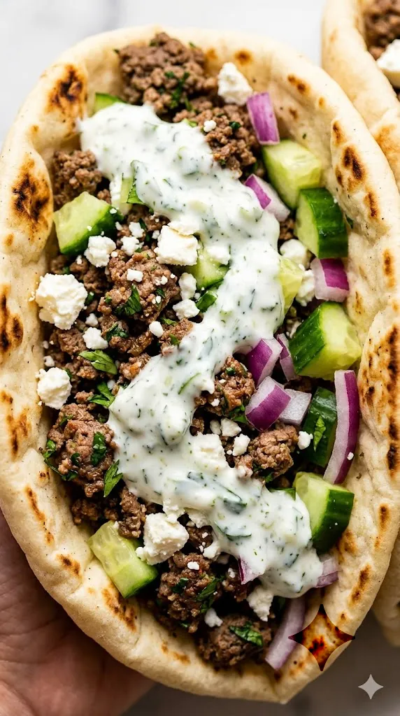 - Stuff the pitawith the cooked ground beef, followed by cucumber, cherry tomatoes, and red onion.