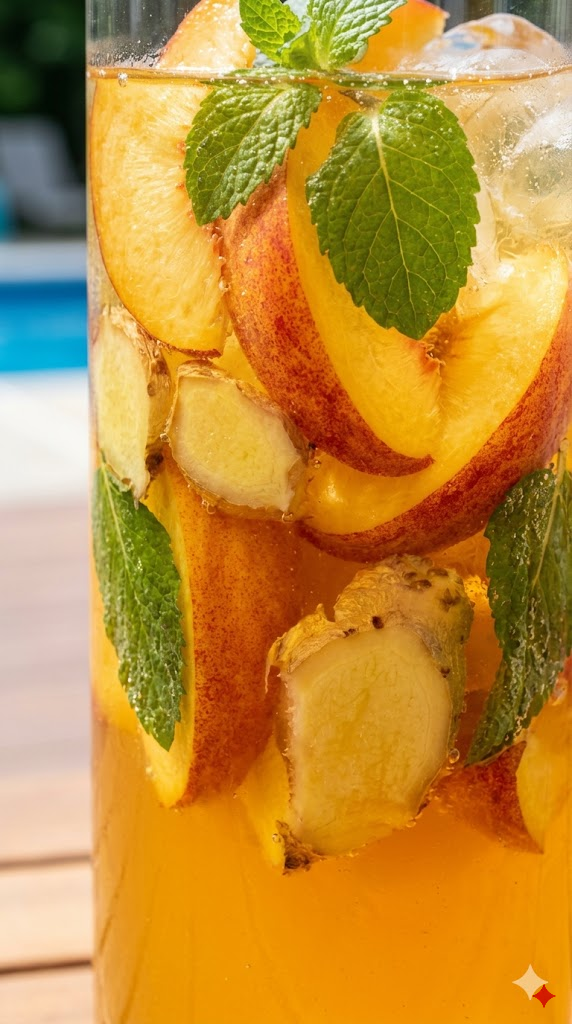 - Add the chilled tea, sliced peaches, sliced ginger, and lemon juice to a large pitcher.