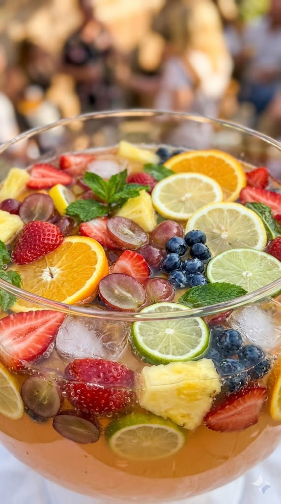 This is the punch that works for everyone. It has that “spa water” elegance but is packed with actual flavor from the fresh fruit juices. The cucumber and mint keep it ultra-clean, and the citrus makes it bright and cheerful. The huge variety of fruit just screams summer fun.