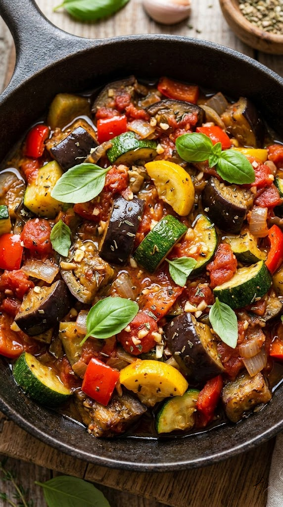 - Simmer for an additional 2–3 minutes, until the ratatouille is hearty and thick. Remove from heat. Tear the fresh basil leaves and toss them in just before serving.