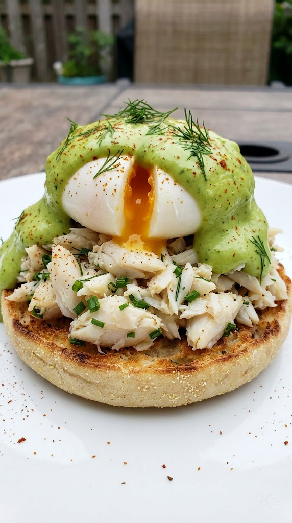 - Assemble: Place a heaping tablespoon of crab meat on each toasted English muffin half. Top with a poached egg and a generous dollop of the avocado cream.