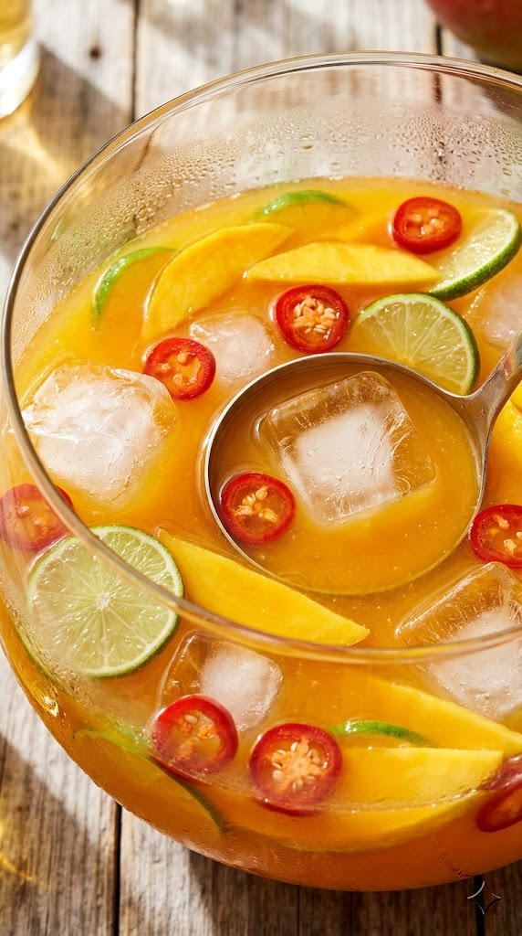 - Garnish heavily with fresh mango slices, vibrant red jalapeño wheels, and lime slices. For a final flourish, you can rim individual glasses with chili-lime seasoning.