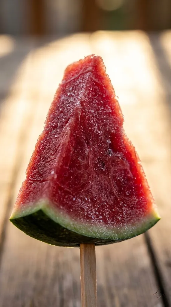 There is zero prep mess. It’s just frozen watermelon on a stick. But when it’s frozen, the texture changes; it becomes densely crystalline and incredibly satisfying to eat. Plus, the rind acts as a natural handle. It’s the ultimate lazy-day snack.