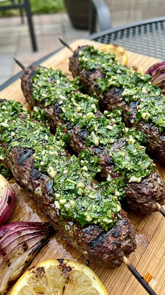 - Serve the hot skewers immediately, drenched in the fresh chimichurri.