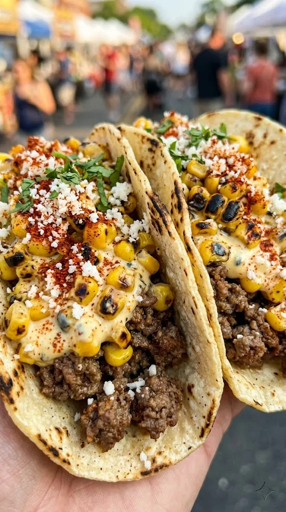 - Assemble: Fill the warm tortillas with the seasoned ground beef. Top generously with the creamy elote corn mixture. Garnish with more chili powder and cilantro.
