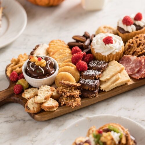 - Kid-Friendly Board: Mini cupcakes, gummy candies, animal crackers, marshmallows, and sliced apples with caramel dip.